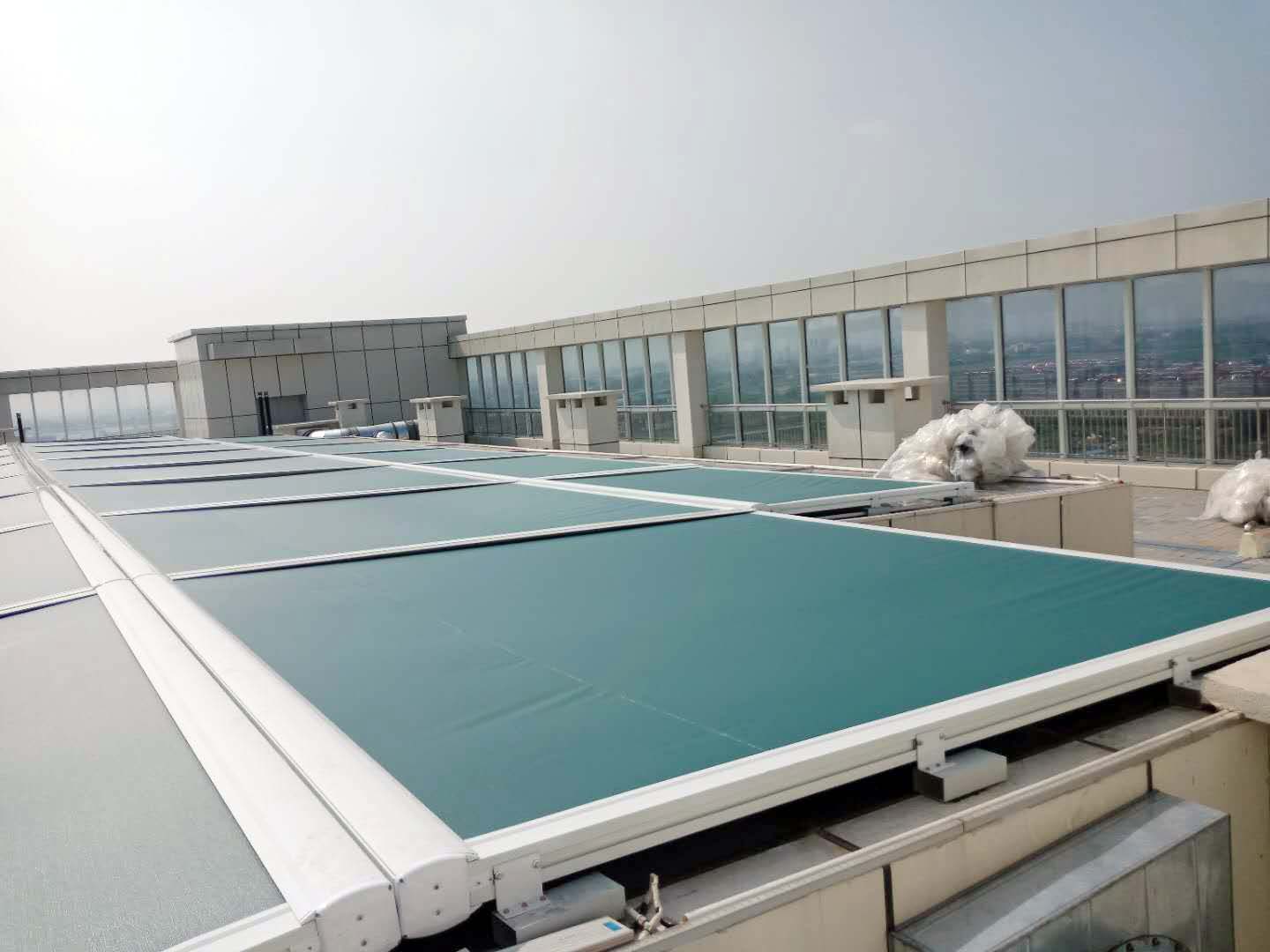 賽尚遮陽與臨沂商城控股集團有限公司在2018年7月初簽訂了臨沂商城藍海大飯店電動天幕簾系統工程合同。工程應用的遮陽產品為電動天幕簾,數量28套,采用了風光雨感應系統。