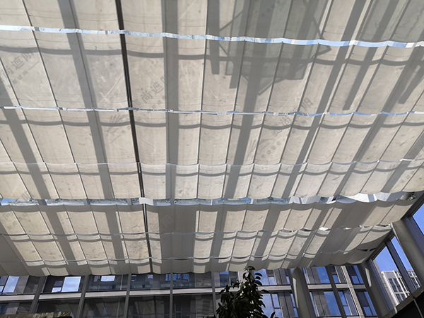 FCS天棚簾系統(tǒng)每個(gè)獨(dú)立單元由一臺(tái)管狀電機(jī)驅(qū)動(dòng),通過循環(huán)鋼絲牽引拖布桿運(yùn)動(dòng),從而帶動(dòng)面料運(yùn)動(dòng),使系統(tǒng)打開或關(guān)閉,以達(dá)到對(duì)光線強(qiáng)弱控制的目的;FCS天棚簾系統(tǒng)被打開時(shí),遮陽面料呈波浪狀。