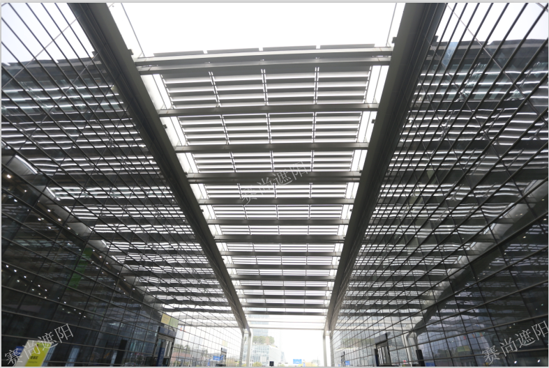深圳會議展覽中心的遮陽工程,有其特殊的應用要求,在遮陽項目的選擇過程中,不僅要求遮陽工程具有裝飾效果,更重要的是其遮陽功能。展廳中心要具有必須的亮度,但該地特有的氣候條件又不允許展場直接暴露于直射陽光下, 所以整個中心展廳的屋面采用遮陽百葉、金屬屋面和采光頂三者有機結合的外觀設計。屋面、側面均選擇使用400mm的梭形百葉作為遮陽百葉。