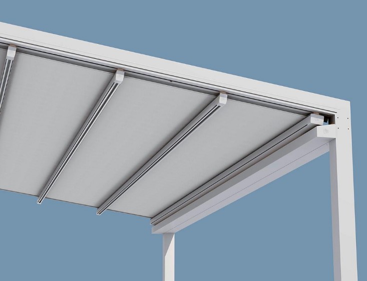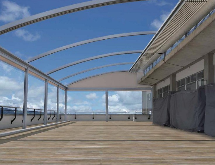 室外防水天棚是一種軌道天蓬和伸縮遮陽蓬的結合。布料通過特制的電機隨鋁制軌道伸縮移動,打開時可讓客戶感受大自然的陽光與空氣,閉合后可以100%防水并有效遮擋陽光。產品能最低承受50km/h的風力(在未有積雪的情況下)。