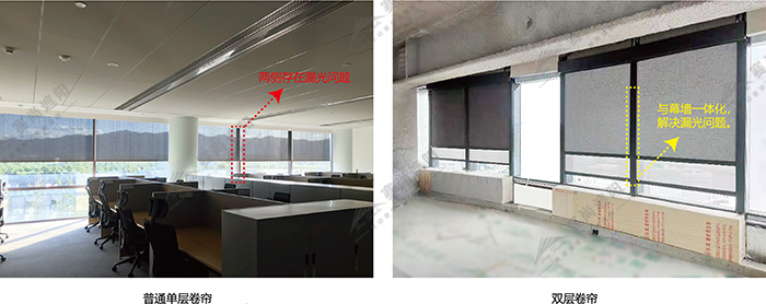 隨著生活水平的越來越高,對于室內(nèi)的光亮度要求也是日益提高,在夜間時室內(nèi)的人往往需要遮光較好的卷簾,從而提供一個舒適的睡覺環(huán)境;而在白天外界的光亮度過高時,白天室內(nèi)活動的人往往希望一個比較低的光亮度,防止強光炫目的同時又能滿足工作時照明的需要,此時普通的單層卷簾就不能同時滿足白天和夜間兩種形式的遮光效果,這樣我們就會去研發(fā)新型的遮陽產(chǎn)品,雙層防風(fēng)卷簾,它獨有的特性就是能與幕墻完美貼合在一起,實現(xiàn)幕墻一體化,方能解決如兩側(cè)不夠密封,遮光效果不佳,還需安裝遮光邊槽等等來解決漏光問題。