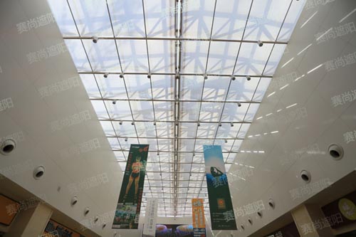 首先,我們先分析一下興業廣場,興業廣場的中心是玻璃做的采光頂,這樣做的好處是增加陽光照入到廣場內部的強度,簡單的說就是為了增加室內亮度。但是,恰恰是這一看似是優點的做法卻帶來了另一個問題,那就是如何進行遮陽。玻璃做的采光頂,早晨或晚上的時候對人們購物的影響肯定不會有多少,但是到了正午,如果沒有合理的遮陽措施,廣場內部肯定會熱的要命。賽尚電動天棚簾,打開時呈平整緊張鋪開,收起時卷曲到一端圓管上,整體效果大方簡潔美觀,具有良好的遮陽效果,同時為室內提供適宜的光線環境。因此興業廣場的設計方很容易就想到了用電動天棚簾進行遮陽。
