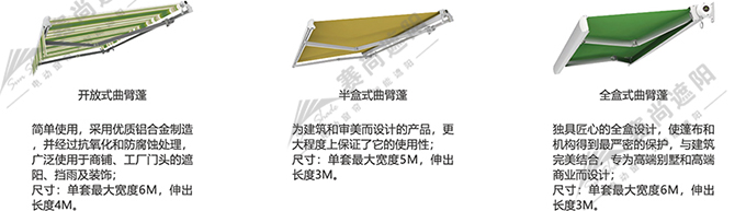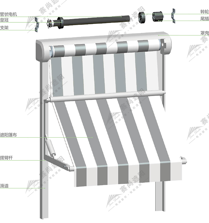 電動遮陽篷是一種裝在戶外的遮陽產(chǎn)品,主要起到遮陽隔熱及外墻美化的作用。使用抗紫外線面料的遮陽篷,可以減少室內(nèi)家具受紫外線的損害,延長室內(nèi)裝修及家具的使用壽命;配合自動光風(fēng)傳感器,即使您不在家,也能給予您的家具和遮陽篷較好的保護(hù)。曲臂或盒式遮陽篷遮擋了炎炎烈日,使用戶的生活空間得以拓展;配合遮陽篷用照明系統(tǒng),可以使電動遮陽篷不分白天黑夜都可以使用。