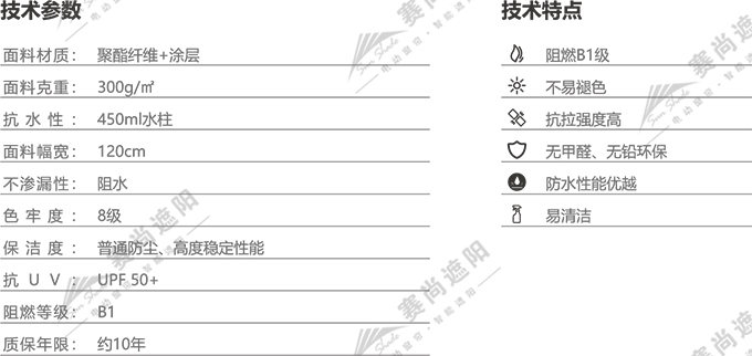 遮陽篷應(yīng)用于室外,故我們選擇面料是需考慮其防水性能、色牢度等因素。可采用腈綸纖維或原液亞克力等材料,其抗水性能及日照色牢度等性能相對較好。基本使用周期10年左右。